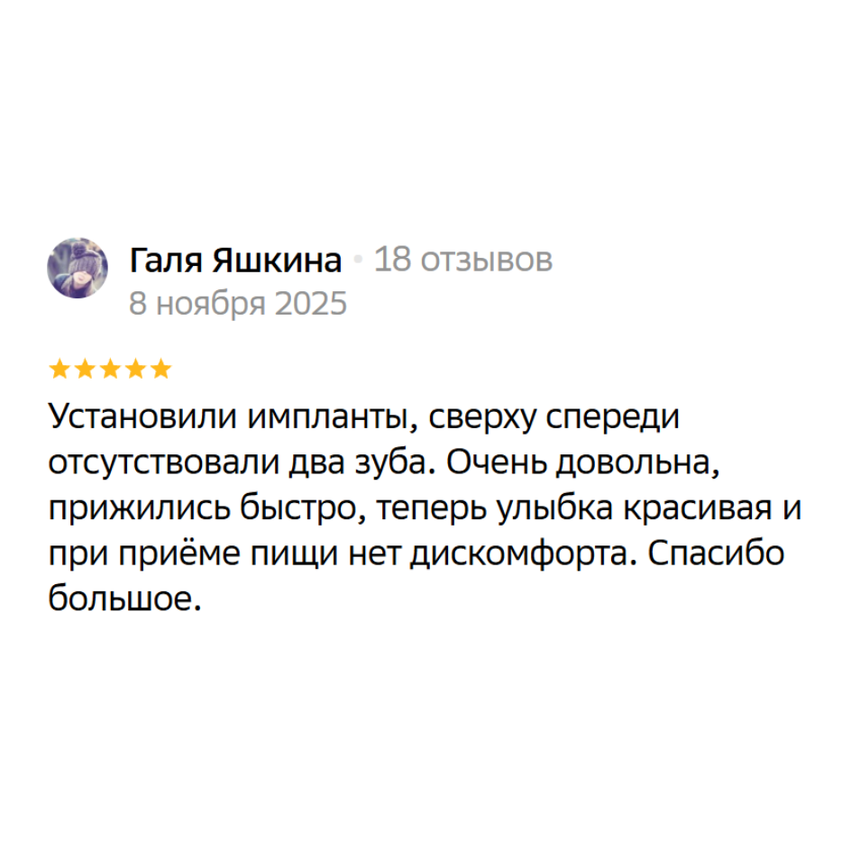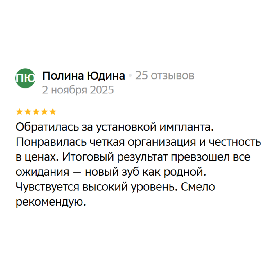 Убедитесь в высоком качестве наших услуг, изучив отзывы наших клиентов, которые оставили свои отзывы после восстановления зубов имплантацией нашим медицинским центром